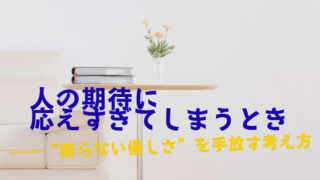 距離感と人間関係の整え方 人の期待に応えすぎてしまうとき――“断らない優しさ”を手放す考え方 人から頼まれると、つい引き受けてしまう。断ったほうが楽だと分かっていても、気づけば「大丈夫です」と答えている。そんな自分に、後から疲れや違和感を覚えることがあります。この記事では、人の期待に応えすぎてしまう理由 と、“断らない優しさ”を手放... 2026.01.16 距離感と人間関係の整え方